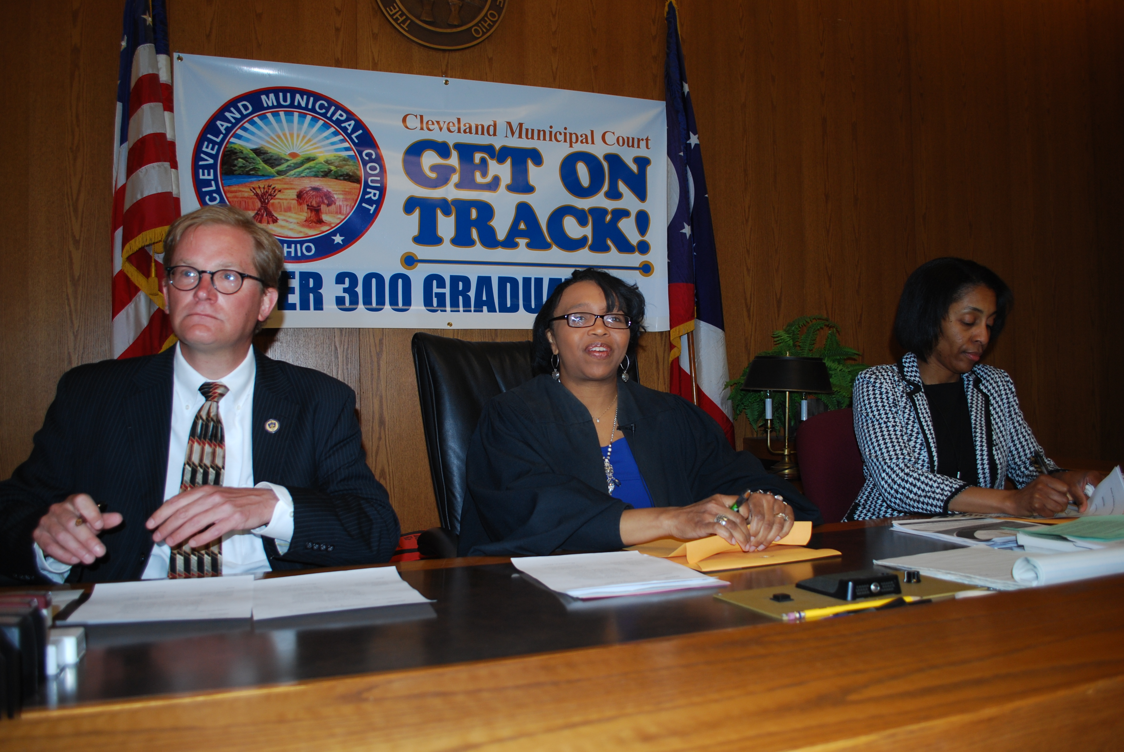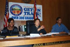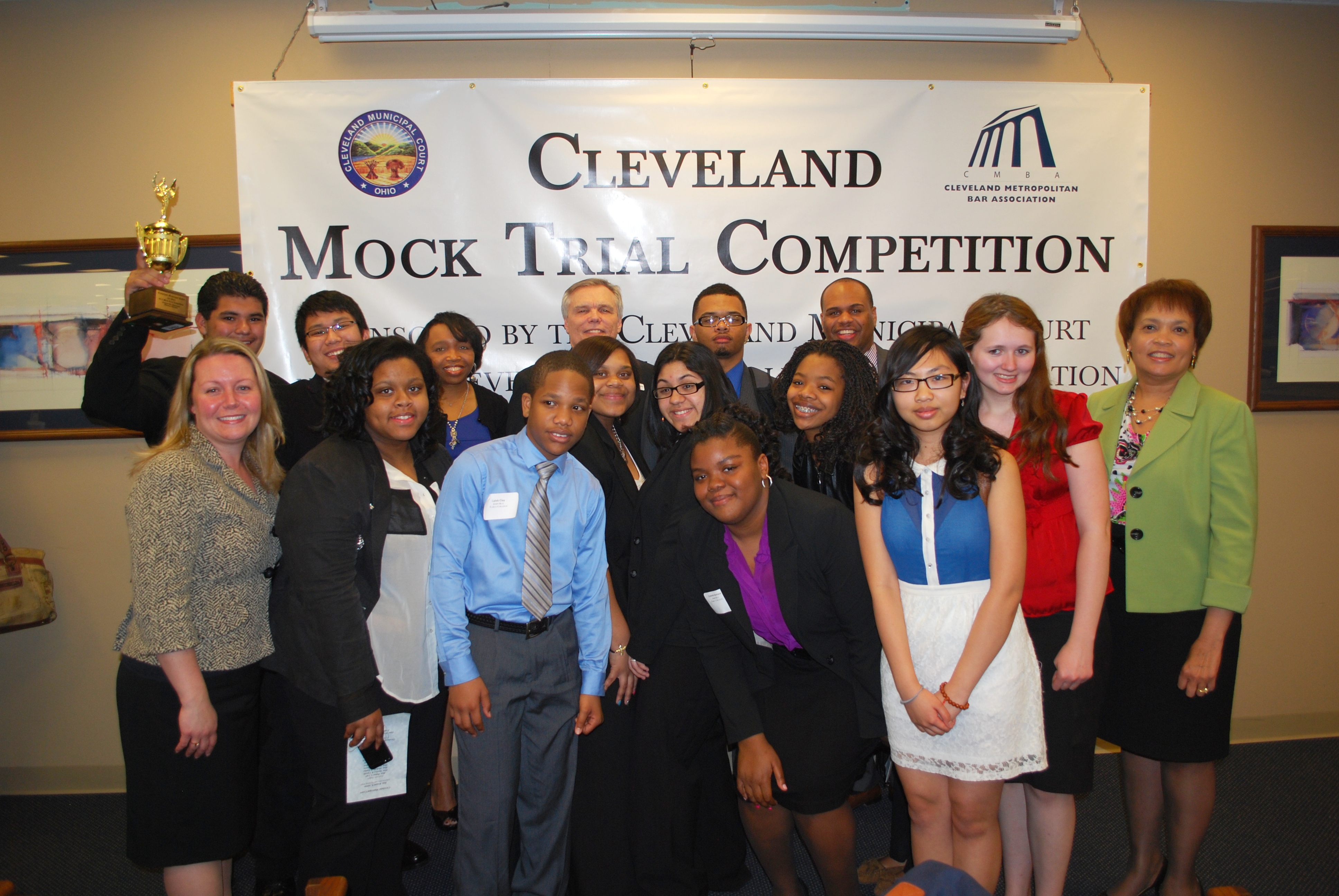 The annual Mock Trial Competition, sponsored by the Cleveland Municipal Court, the Cleveland Metropolitan School District and the Cleveland Bar Association, is going into its 17th year. The program, under the direction of Judge Lauren C. Moore, involves 250-350 Cleveland students and their teachers who end up spending an entire day at the Justice Center presenting both sides of a hypothetical case that is based upon similar cases before the court. These cases involve such issues as stalking, driving under the influence, and children gaining access to firearms. The ultimate aim of the Mock Trial Competition is to improve student listening, speaking and reasoning skills and to better familiarize them with the justice system.